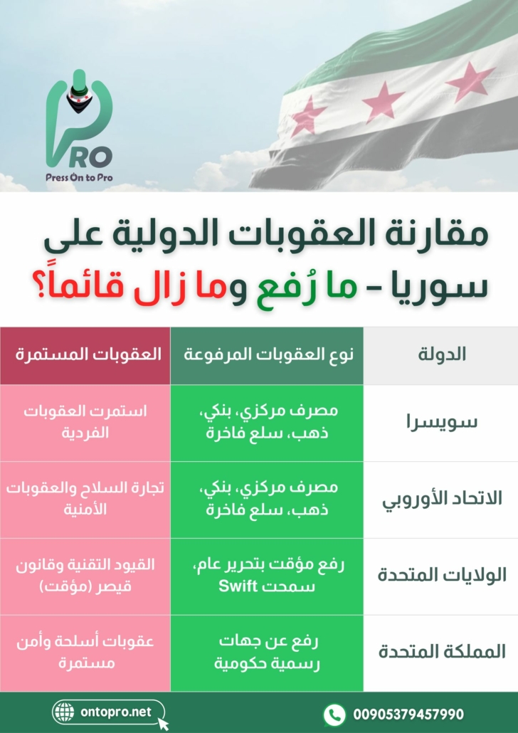 📊 في ظل التطورات الأخيرة على صعيد رفع العقوبات عن سوريا من قبل سويسرا والاتحاد الأوروبي والولايات المتحدة، قمنا بإعداد جدول مرجعي مبسّط يوضح: